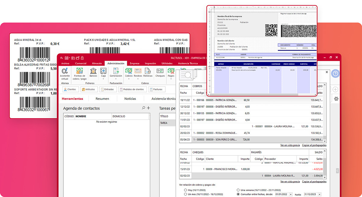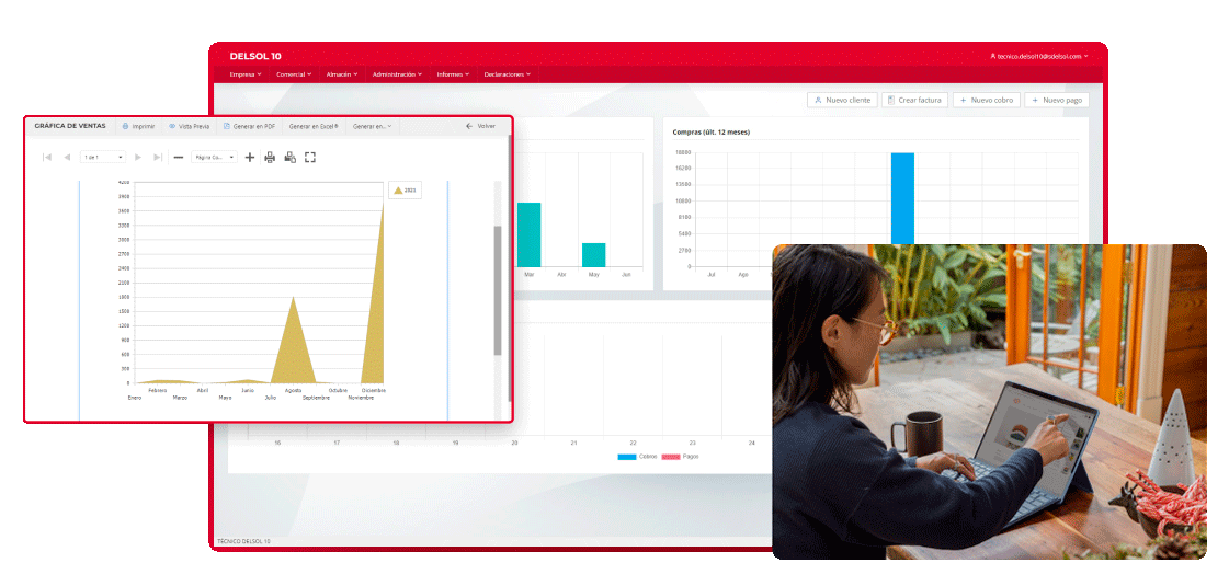 Creación y gestión sencilla de facturas electrónicas, incluyendo formato Facturae para administraciones públicas y cumplimiento con la normativa Verifactu y Ley Antifraude.